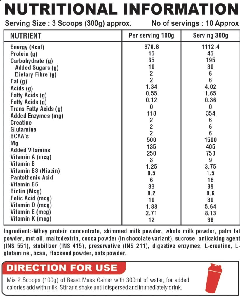 Bulk Up the Right Way Beast Mass Gainer is your go-to formula for serious muscle gains and optimal recovery. Packed with high-quality proteins, clean carbohydrates, and essential nutrients, it’s designed to help you build lean mass without unwanted fat. Key Benefits: Maximize Muscle Growth: Delivers the perfect ratio of proteins and carbs to support lean muscle gains. Boost Energy Levels: Fuels your body with the energy needed for intense training sessions. Speed Up Recovery: Reduces muscle soreness and replenishes glycogen stores post-workout. Easy to Digest: Gentle on your stomach with fast-absorbing nutrients. Why Choose Beast Mass Gainer? Superior taste and mixability. Enriched with essential vitamins and minerals. Ideal for hard gainers and anyone looking to bulk up. Usage Instructions: Mix 2 scoops (100g) with 300-400ml of water or milk. Consume 1-2 times daily, ideally post-workout or between meals. Ingredients: [Include specifics like Whey Protein, Maltodextrin, Creatine Monohydrate, BCAAs, etc., if applicable.] Achieve your mass-building goals with Beast Mass Gainer – the perfect companion for your bulking phase.